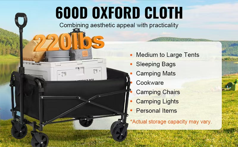 • Outdoor Camping Wagon: Made of 600D high-density Oxford cloth, it boasts excellent wear resistance and tear resistance, easily tackling rugged terrain and harsh weather. The spacious interior can accommodate medium to large tents, sleeping bags, camping mats, cookware, camping chairs, camping lights, and various other equipment, meeting your multi-day camping needs. The foldable design ensures convenient storage and transportation, saving space. Equipped with an adjustable handle and wide tires, it adapts to different terrains, making pushing and pulling effortless.