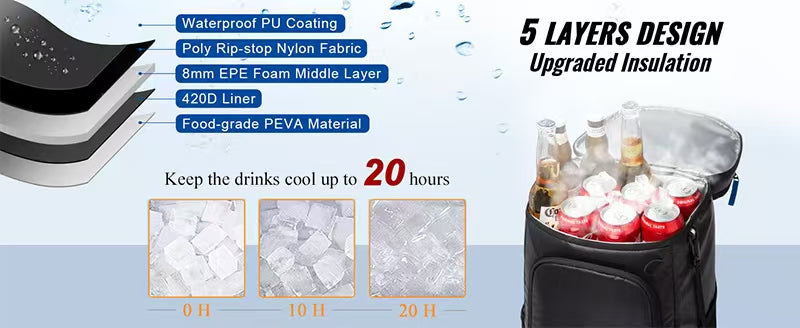 • Outdoor Insulated Cooler Bag: Featuring a 5-layer design with an 8mm EPE foam middle layer and enhanced insulation materials, this cooler bag effectively blocks external temperatures, ensuring long-lasting cold retention inside. The outer layer is made of waterproof PU coating and Poly Rip-stop nylon fabric, offering excellent water resistance and durability to withstand various outdoor conditions. This cooler bag can keep drinks cold for up to 20 hours, making it perfect for chilled beverages or fresh ingredients during outdoor activities.