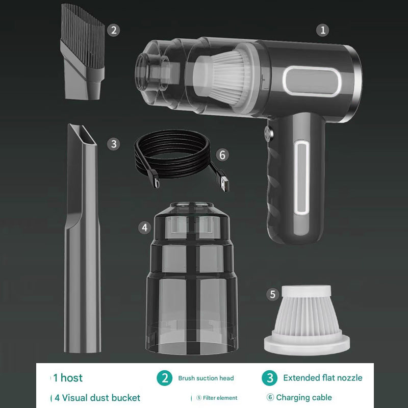 3-in-1 car vacuum cleaner: Handheld vacuum cleaner with 6 accessories can be used for sucking, blowing and inflating in 3 modes to meet your different usage scenarios. The floor brush and nozzle brush can easily pick up all kinds of debris. The blowing nozzle can be used to blow away dust from keyboards and narrow crevices. Two sizes of universal nozzles to quickly inflate or expel air from objects such as swimming rings, mattresses, etc.