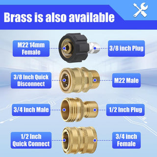 Variety of connectors: This pressure washer adapter set is crafted with brass for durability and strength, ensuring long-lasting performance. The set includes a variety of connectors to suit your needs, such as: M22 14mm Female; 3/8 inch Quick Disconnect; 3/4 inch Male; 1/2 inch Quick Connect; 3/8 inch Plug; M22 Male; 1/2 inch Plug; 3/4 inch Female. These adapters are designed for easy and secure connections, making it effortless to link your pressure washer pump, hose, and accessories. Whether you’re upgrading or replacing parts, this set is compatible with most standard pressure washer setups, ensuring a leak-free, reliable performance.