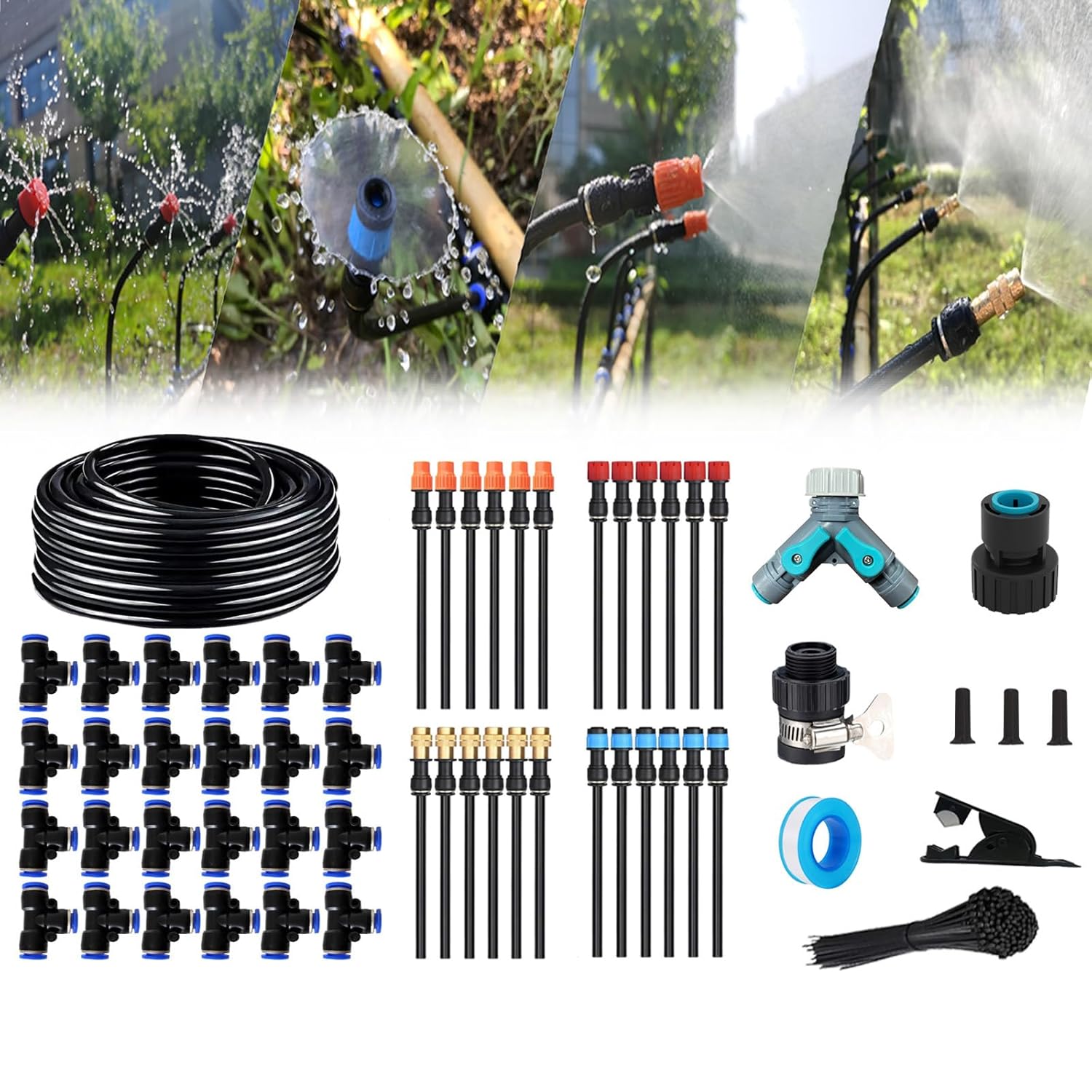 Rich watering system: Irrigation system including 66FT tube, 24Pcs 360 degree bending dropper, Eight hole red dropper, fan blue dropper, orange atomization dropper, copper atomizing droppers 6pcs each, 24pcs Tee, 1pcs quick connector, 1pcs Y type water distributor, 1pcs universeal faucet connector,pipe cutter and a bundle of cable ties. Everything you need is included in this comprehensive irrigation system.