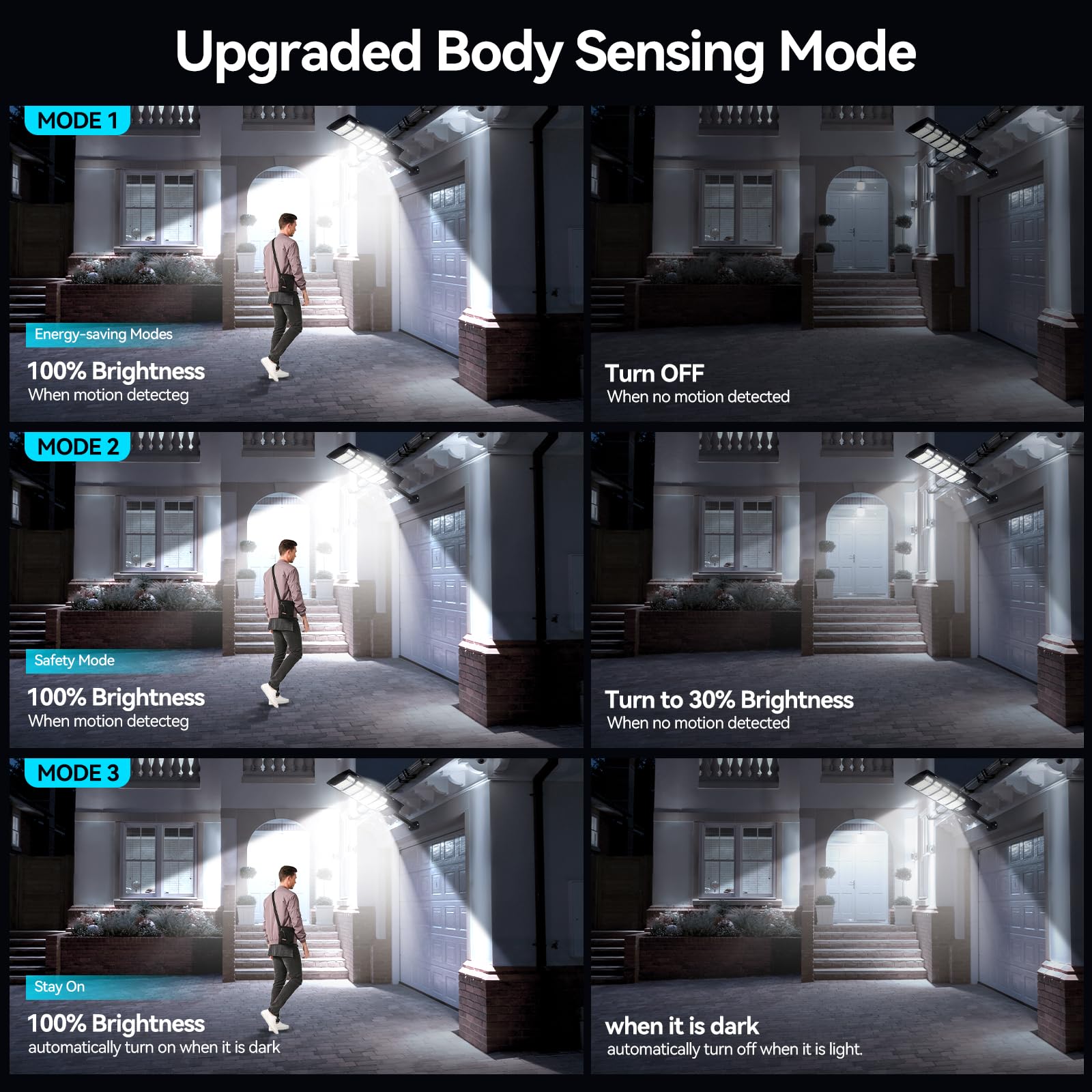 • Smart lighting modes: Choose from 3 lighting modes—MODE 1 for motion-activated full brightness lasting 12-14 hours, MODE 2 for a combination of full and 20% brightness for 6-8 hours, and MODE 3 for steady 50% brightness for up to 2 hours.