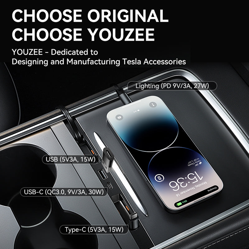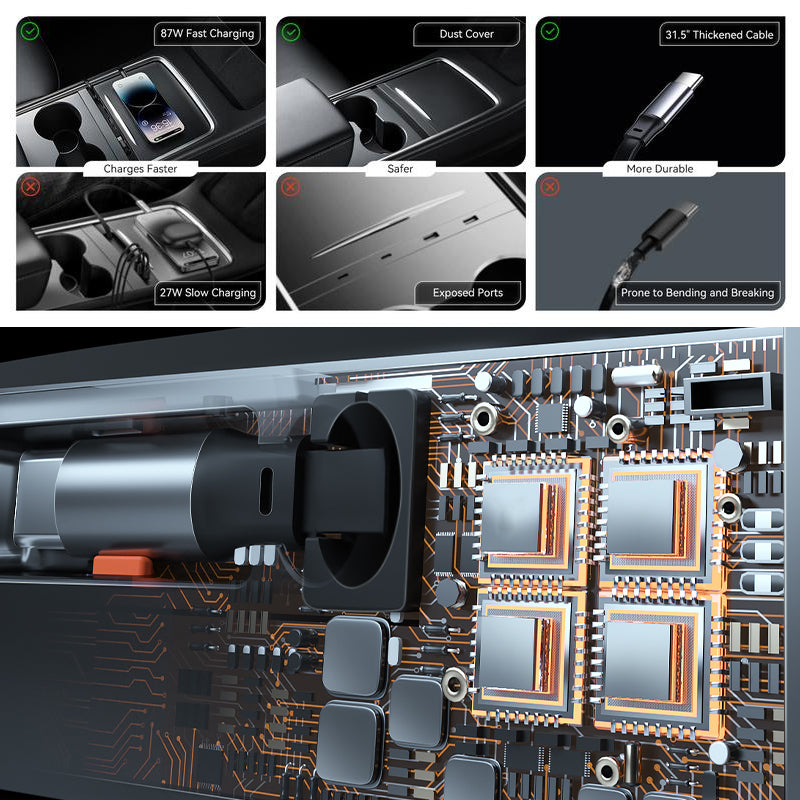 4 ports for fast charging: The USB hub for Tesla Model 3/Y features 2 Type-C cable, free retractable up to 31.5inch. And 2 charging ports for USB and Type C. The charging cable is retractable, once you are done charging pull the cable back and it will retract back. It keeps everything clean and solves the problem of wires getting twisted. It is a great addition to your car.